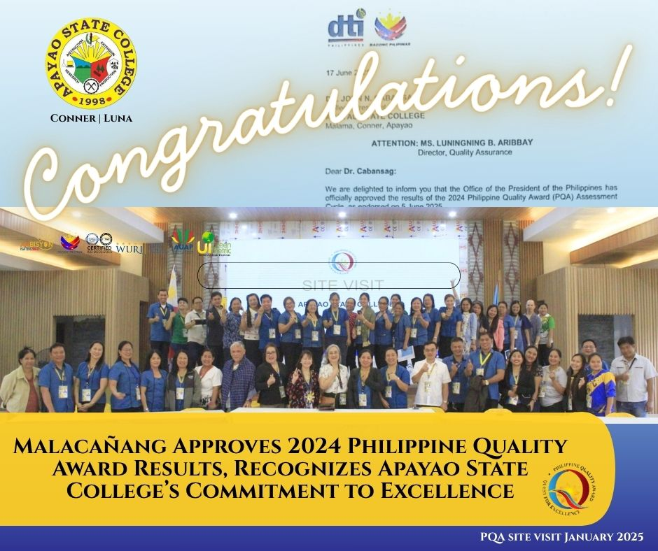 We are proud to share a momentous milestone in the history of Apayao State College (ASC) as the Office of the President of the Philippines has officially approved the results of the 2024 Philippine Quality Award (PQA) Assessment Cycle, following the endorsement made on June 5, 2025.